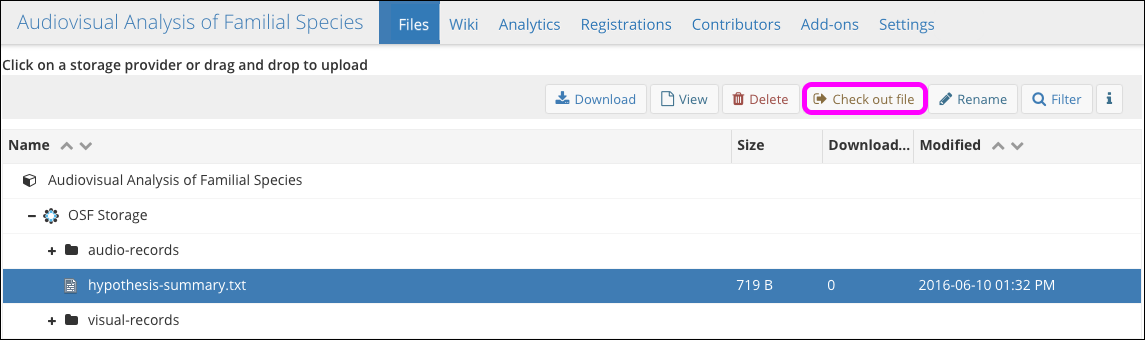 一起進行研究計畫的團隊人員要經常分析的資訊有資料檔案,執行紀錄與報告等。資料媒介因研究性質而異。OSF提供可協作維護的Wiki與檔案系統,讓協作者根據實際需要設定與增修內容。