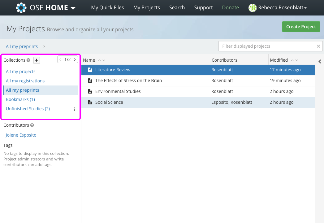 OSF的專案管理介面已預設歸類使用者已發佈預印本的專案(All my preprints),以及已註冊的專案(All my registrations)。只要從左側視窗選擇這些歸類,就會只顯示這類專案。