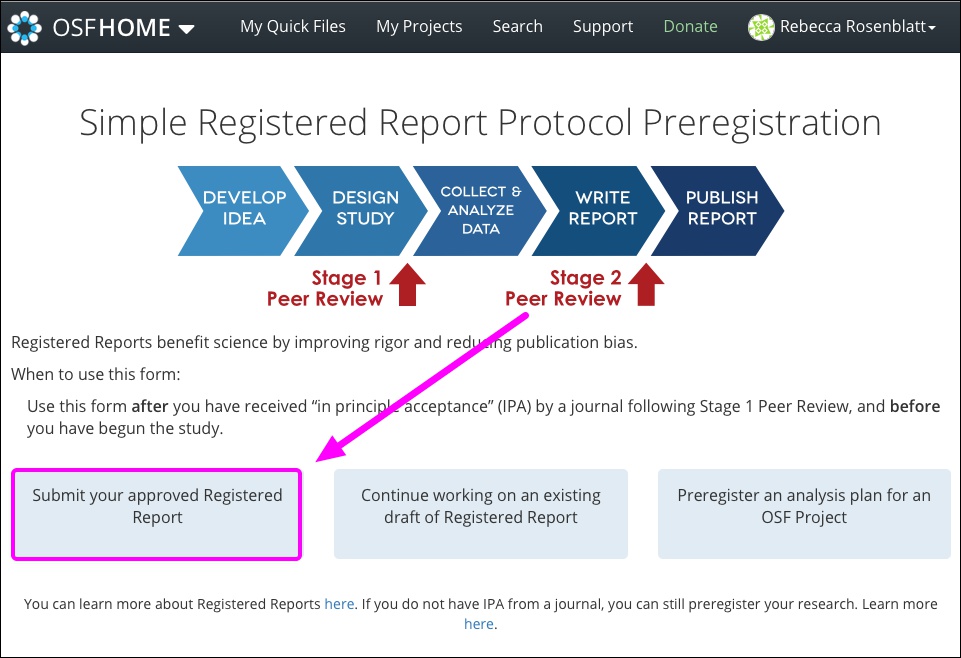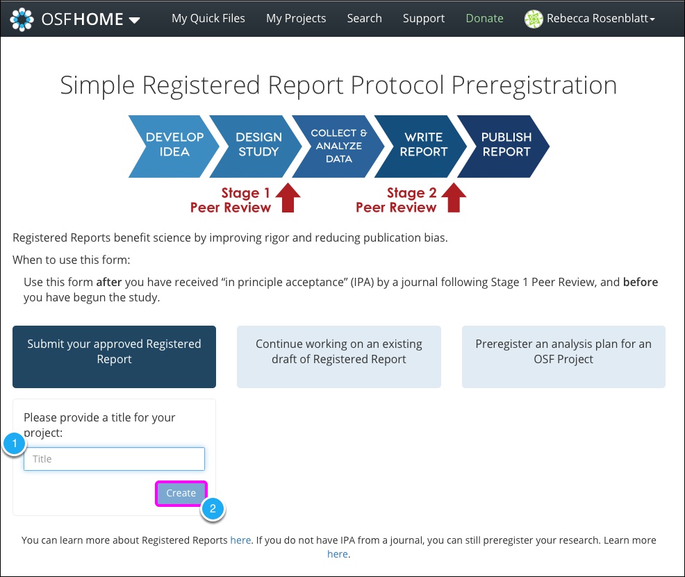 RR專頁的立意是提供研究者與期刊編輯評審,在公開平台檢視通過第一階段評審的計畫書,研究者按照計畫執行的實際達成度,因此以下畫面中的箭頭是從第二階段指向創建專案的按鈕。