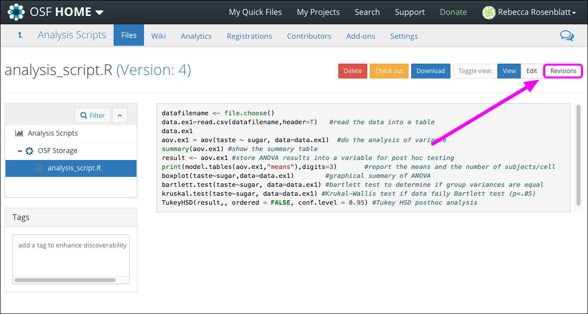 如果再更新一次並上傳,OSF就會判定為第4版。從檔案內容檢視畫面,使用者可以使用畫面上方功能選單裡的Revisions,檢視檔案版本更新歷程。