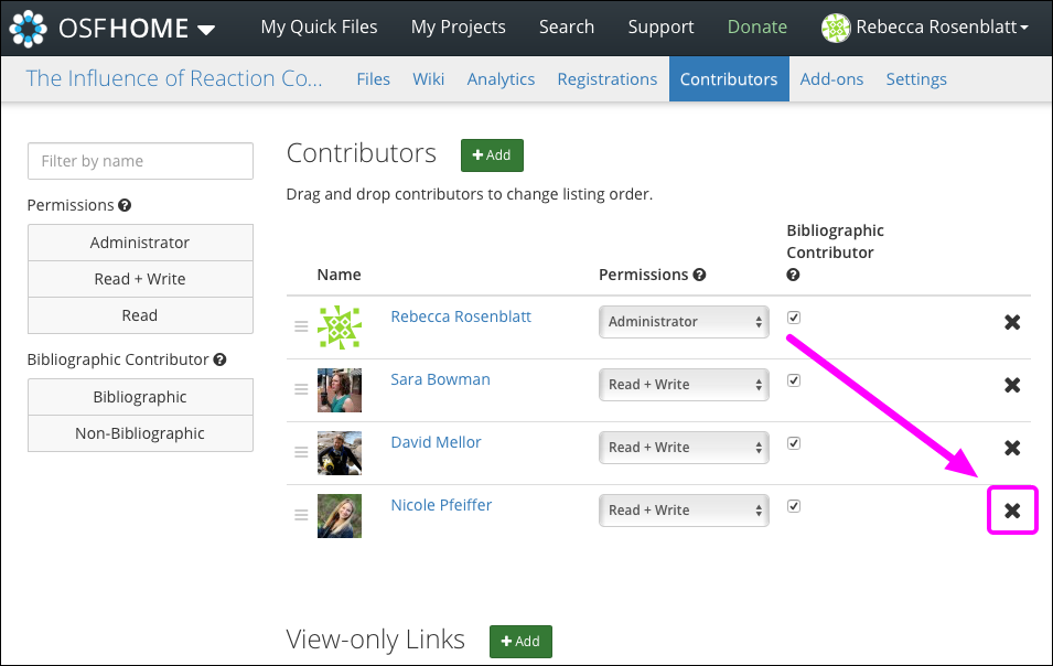每個OSF專案與物件都可以指定協作者,合作管理專案與物件的內容。官方網站有詳細說明,以下簡單說明OSF的三種權限設定:
